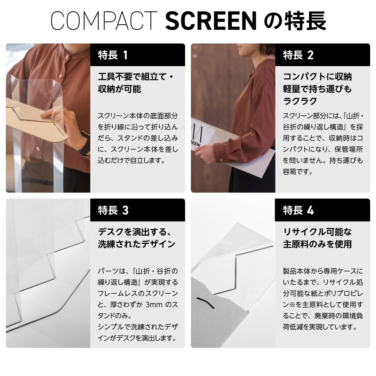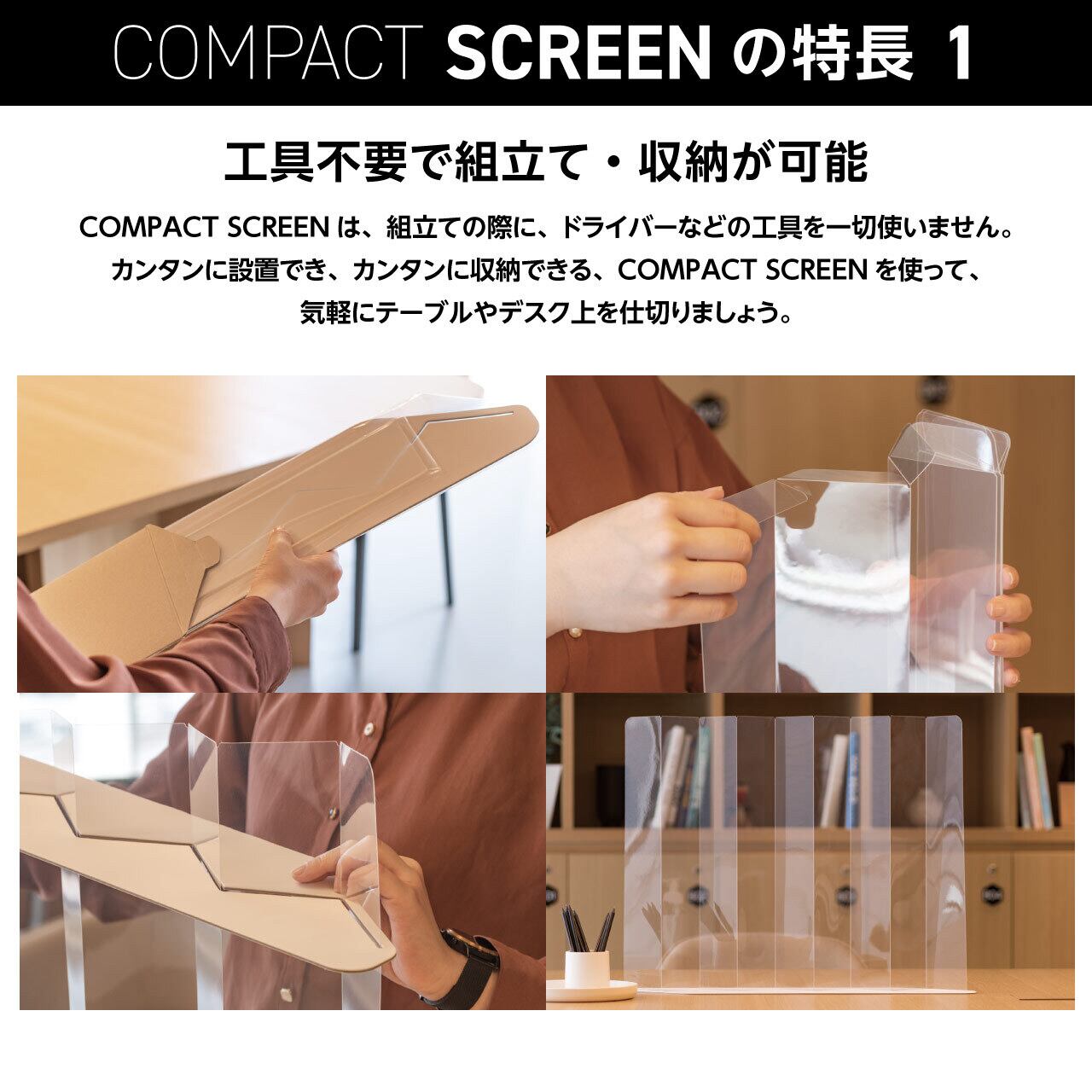 COMPACT SCREENは、工具不要で組み立てられ、