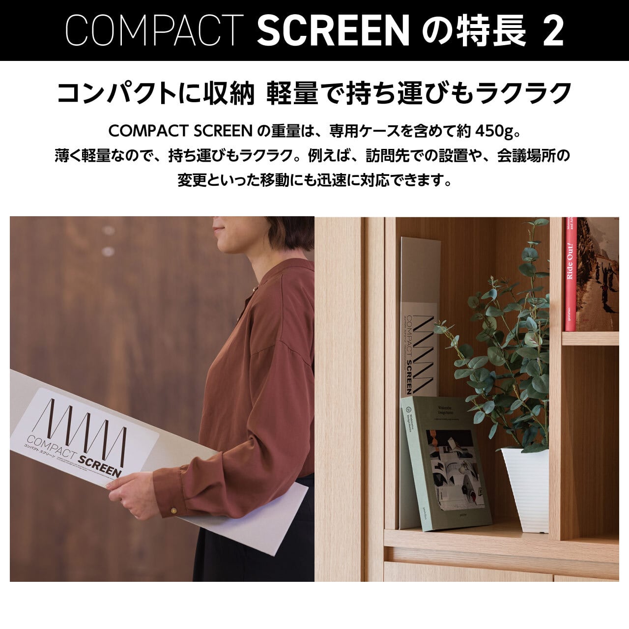 収納時に省スペースゆえに複数個保管しても負担が少ない、COMPACT SCREENならではの使い方です。